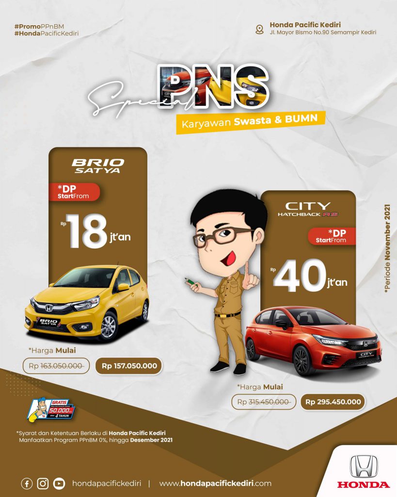 [vc_row][vc_column][vc_single_image image=”4840″ img_size=”full” label=””][/vc_column][/vc_row][vc_row][vc_column][vc_column_text]Special untuk Anda yang bekerja sebagai PNS, Karyawan Swasta atau Karyawan BUMN, dapatkan Spesial Promo PNS, Karyawan Swasta dan BUMN dengan Discount Up Rp 20.000.000,- setiap pembelian Honda City Hatchback RS, serta penawaran kredit dengan DP Minim mulai dengan Rp 18 Jutaan untuk New Honda Brio, dan Rp. 40 jutaan untuk Honda […]