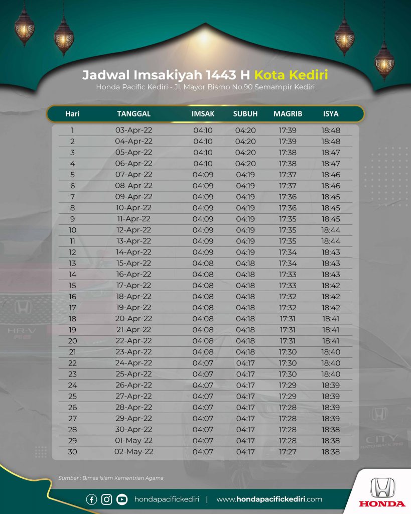 Jadwal Imsakiyah Kota Kediri 2022 M Hallo Dolor Honda Pacific Kediri, Ramadhan telah tiba, saatnya kita kembali menjalankan ibadah wajib di bulan yang suci ini. Untuk itu Honda Pacific Kediri mengucapkan Selamat Menunaikan Ibadah puasa bagi yang Dolor-dolor yang menjalankan. Berikut kami sampaikan Jadwal Imsakiyah Ramadhan 1443 H / 2022 M untuk wilayah Kota Kediri […]